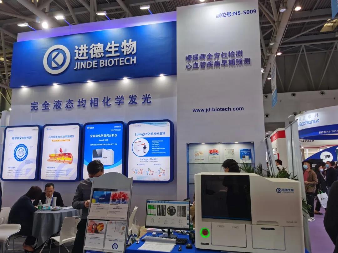 本次盛會進(jìn)德生物攜新品亮相,向業(yè)界展示了公司自主研發(fā)的全自動化學(xué)發(fā)光分析儀及配套診斷試劑產(chǎn)品。全球首創(chuàng)的發(fā)光平臺、差異化的產(chǎn)品路線吸引了眾多客戶和業(yè)界同行駐足咨詢,公司工作人員熱情地為客戶答疑解惑,與客戶溝通交流,介紹產(chǎn)品性能和市場前景,現(xiàn)場氛圍熱烈。