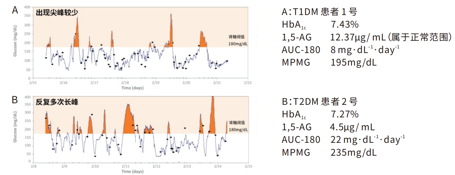 HbA1c 無法有效反映短期血糖波動和餐后血糖狀態(tài)(分別為7.43%和7.27%),低?平1,5-AG可有效反映短期血糖波動(AUC-180)和餐后血糖狀態(tài)(MPMG)。