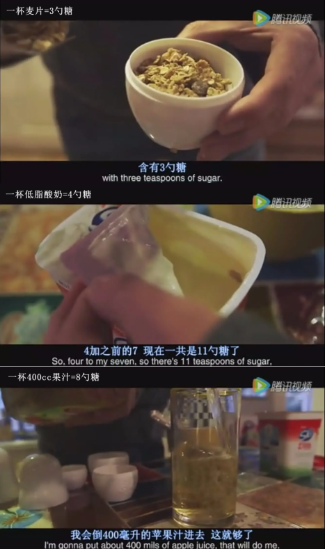 實(shí)驗(yàn)中選取的健康飲食:麥片+低脂酸奶+蘋果汁(試驗(yàn)中達(dá)蒙攝入量:2.5杯燕麥+一杯酸奶+400ml果汁)就這樣簡(jiǎn)簡(jiǎn)單單的飲食,就高達(dá)20勺的糖含量(即60g碳水化合物),且是在未攝入其他食物及零食的情況下。