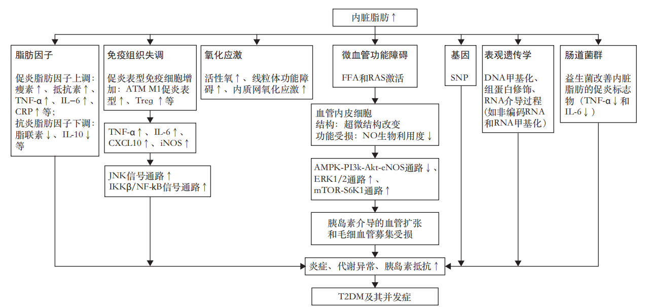 相比摸得到的皮下脂肪,內(nèi)臟脂肪能夠產(chǎn)生較高水平的游離脂肪酸、脂肪因子和炎癥標(biāo)志物,與外周胰島素敏感性下降和全身尤其肝臟胰島素抵抗密切相關(guān),與T2DM發(fā)病緊密關(guān)聯(lián)。