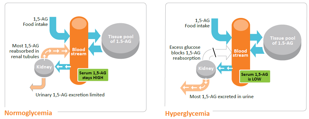 體內(nèi)1,5 - AG主要來(lái)源于食物,正常人每天平均從食物中獲得5 - 10mg,食入后通過(guò)小腸迅速吸收,吸收后經(jīng)過(guò)血液循環(huán)分布于各組織、臟器。從食物中攝入的1,5 - AG會(huì)從尿液中排出,攝入的1,5 - AG與尿排出的1,5 - AG形成了一個(gè)平衡,且其日吸收量與日排量成正比。在體內(nèi)1,5 - AG有一個(gè)龐大的代謝池,很少被降解或代謝,總含量維持在500 - 1000mg【3】 。因此血液中的1,5 - AG濃度不受進(jìn)食、忌食、肥胖、運(yùn)動(dòng)、應(yīng)激及服用各種藥物等多種因素的影響,非常穩(wěn)定。