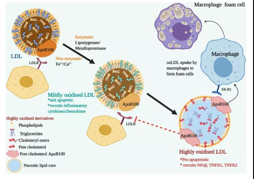 氧化低密度脂蛋白(ox-LDL)是低密度脂蛋白被完全氧化后,誘導(dǎo)巨噬細(xì)胞內(nèi)的膽固醇積聚和泡沫細(xì)胞形成的元兇,是動脈粥樣硬化的重要危險因素[5]。