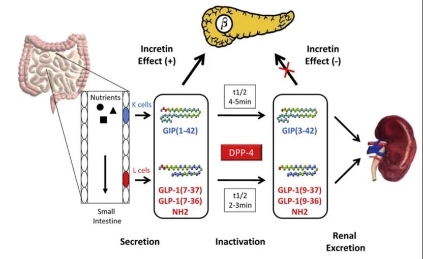 腸促胰素肽(Incretin peptides)[4]是進食后由腸道的內(nèi)分泌細胞分泌的激素,促進機體產(chǎn)生適當?shù)牟秃笠葝u素分泌。