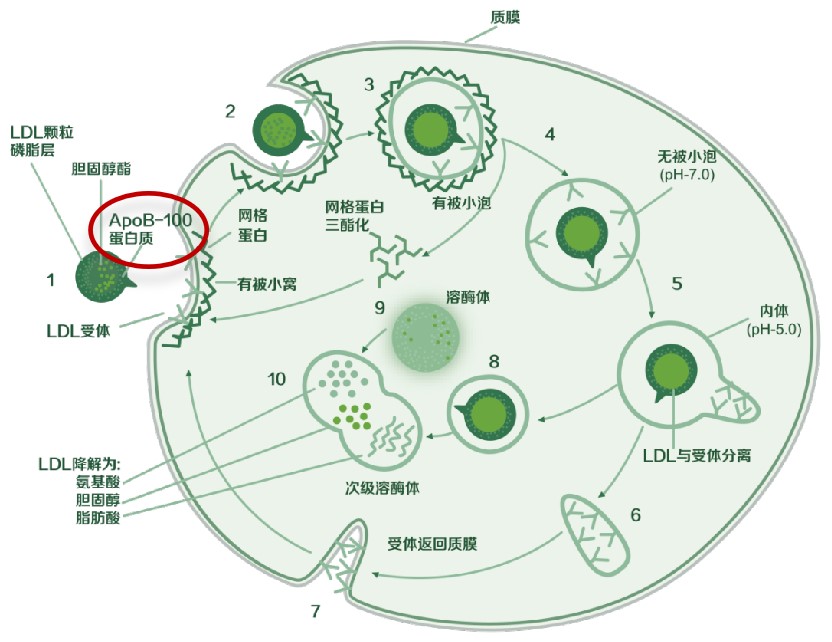 在正常情況下,天然LDL由LDL受體識別。LDL和LDL受體結(jié)合后,內(nèi)吞入細(xì)胞,與溶酶體結(jié)合。在溶酶體酶的作用下,蛋白質(zhì)降解為氨基酸,膽固醇酯水解為游離膽固醇和脂肪酸。此受體受到細(xì)胞內(nèi)膽固醇含量的下降調(diào)節(jié),當(dāng)細(xì)胞內(nèi)膽固醇的含量增多時(shí),LDL受體的量便會減少。所以,天然LDL經(jīng)這一途徑代謝,不會引起膽固醇酯在細(xì)胞內(nèi)堆積。