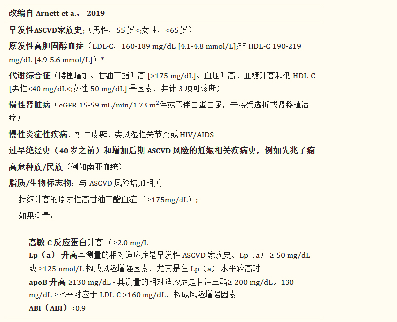 與ASCVD風(fēng)險(xiǎn)增加相關(guān)的臨床因素包括早發(fā)性ASCVD家族史、原發(fā)性高膽固醇血癥、代謝綜合征、性別特異性風(fēng)險(xiǎn)增強(qiáng)因素、慢性炎癥和慢性腎病等。