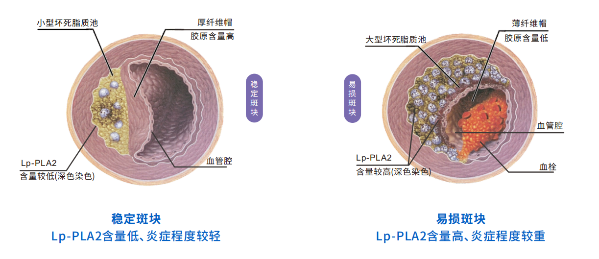 Lp-PLA2(脂蛋白相關(guān)磷脂酶A2)由成熟的巨噬細(xì)胞和淋巴細(xì)胞合成和分泌,受炎性介質(zhì)的調(diào)節(jié),80%與LDL結(jié)合,能水解LDL上的卵磷脂,生成促炎物質(zhì),具有促炎癥和促動(dòng)脈粥樣硬化的作用。檢測脂蛋白相關(guān)磷脂酶A2可以直接準(zhǔn)確的反映血管內(nèi)皮炎癥發(fā)展程度和動(dòng)脈粥樣硬化班塊的炎癥發(fā)展階段,同時(shí)也可作為一個(gè)動(dòng)態(tài)指標(biāo)監(jiān)測心腦血管疾病的風(fēng)險(xiǎn)變化。