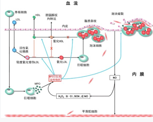 髓過氧化物酶(MPO)是來源于白細(xì)胞的一種酶,主要存在于嗜中性粒細(xì)胞和巨噬細(xì)胞中。其通過產(chǎn)生自由基和多種反應(yīng)性物質(zhì),促進(jìn)斑塊形成和不穩(wěn)定性增加,加速動(dòng)脈粥樣硬化進(jìn)展,進(jìn)而引起多種并發(fā)癥。