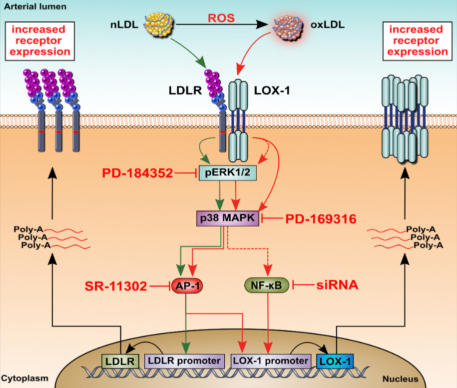凝集素樣氧化低密度脂蛋白受體-1(LOX-1)主要在內(nèi)皮細(xì)胞中表達(dá),它是介導(dǎo)ox-LDL內(nèi)皮吞噬作用的最重要受體,可誘導(dǎo)脂質(zhì)應(yīng)激破壞內(nèi)皮屏障功能,導(dǎo)致內(nèi)皮細(xì)胞中的脂質(zhì)沉積、氧化應(yīng)激和炎癥,造成動(dòng)脈粥樣硬化。