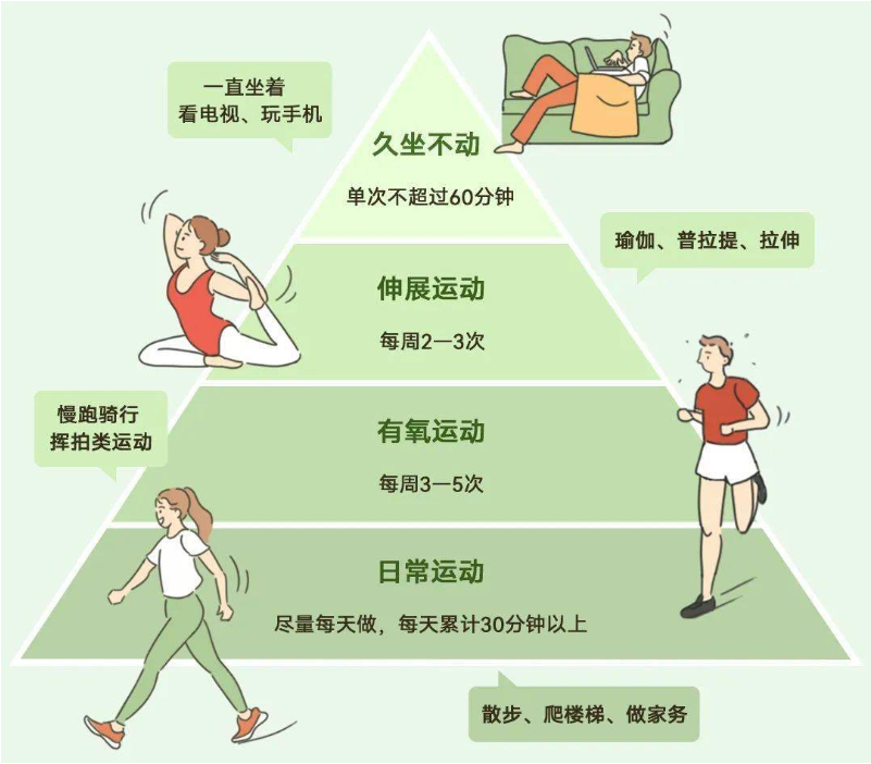 若平時很忙或者剛開始進(jìn)行運動,就可以先從第一層的日常運動開始,利用瑣碎時間散散步,做做家務(wù)。相關(guān)研究顯示,與從不運動的人相比,每天走路30分鐘以上的,可以降低46%的潛在患病風(fēng)險。