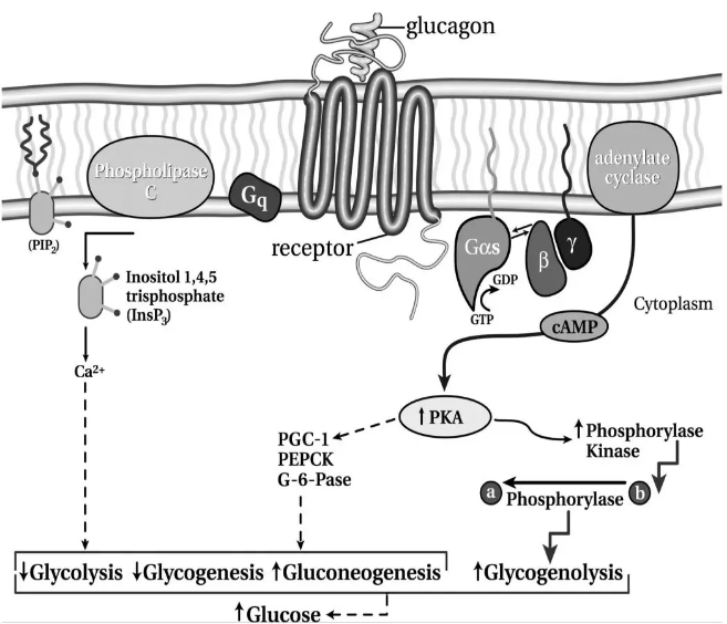 胰高血糖素是一種反調(diào)節(jié)激素,刺激肝臟葡萄糖的產(chǎn)生,以避免低血糖。胰高血糖素受體位于肝細(xì)胞上,在腎臟、心臟、胃腸道、脂肪組織、大腦和脾臟中也發(fā)現(xiàn)了胰高血糖素結(jié)合位點(diǎn)。根據(jù)對(duì)狗的研究,大約17%的胰高血糖素被腎臟降解,20%到25%在肝臟中降解。胰高血糖素對(duì)低血糖反應(yīng)的釋放已經(jīng)被很好地證實(shí),并通過自主、內(nèi)分泌和旁分泌機(jī)制介導(dǎo),可能還通過α細(xì)胞直接感知血糖水平。細(xì)胞分泌胰高血糖素的確切分子機(jī)制尚不完全清楚,但涉及三磷酸鉀腺苷(KATP)通道和鈣通道。